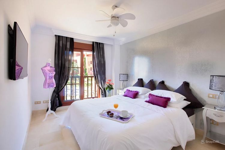De hoofdslaapkamer heeft een en-suite badkamer en directe toegang tot het terras. Twee extra slaapkamers delen een moderne badkamer. De woning is voorzien van airconditioning (warm en koud), marmeren vloeren, inbouwkasten en hoogwaardige afwerking.