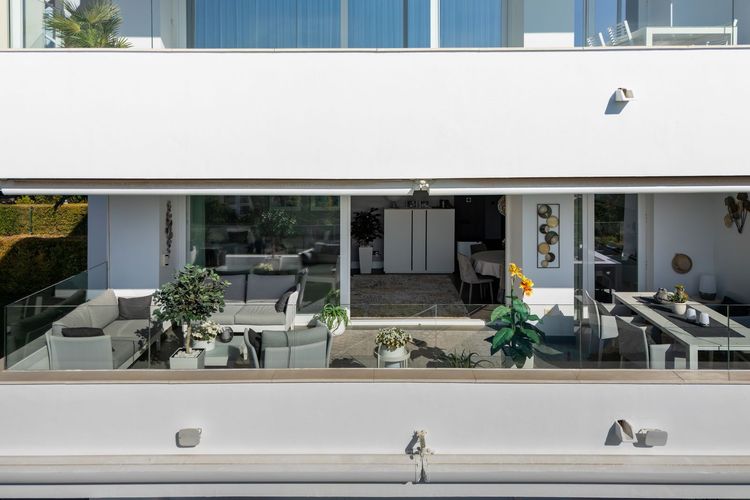 Het stijlvolle appartement op de eerste verdieping overtuigt met een doordachte indeling en lichte, open woonruimtes. Grote schuifdeuren leiden naar een ruim, overdekt terras dat binnen en buiten harmonieus met elkaar verbindt.