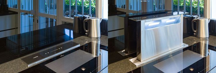Open, moderne keuken met alle hoogwaardige apparatuur (vaatwasser, 2 koelkasten, oven, inductiekookplaat, moderne stoomafzuigkap, magnetron, enz.), bar en sfeervolle ledverlichting.