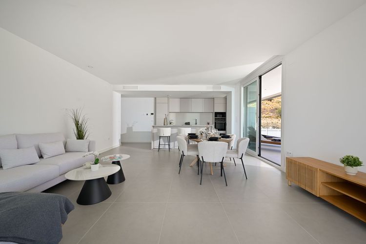 Het appartement heeft een lichte, open indeling waarbij de ruime woonkamer naadloos overgaat in een volledig uitgeruste keuken. Een groot terras op het zuidoosten biedt een panoramisch uitzicht op de zee, de bergen, het zwembad en het omliggende landschap. De hoofdslaapkamer beschikt over een en-suite badkamer, terwijl de twee andere slaapkamers even ruim en stijlvol zijn. Praktische voorzieningen zijn onder andere een wasruimte, een smart home-systeem (domotica), twee eigen ondergrondse parkeerplaatsen en een berging – allemaal ontworpen voor maximaal comfort en gemak.