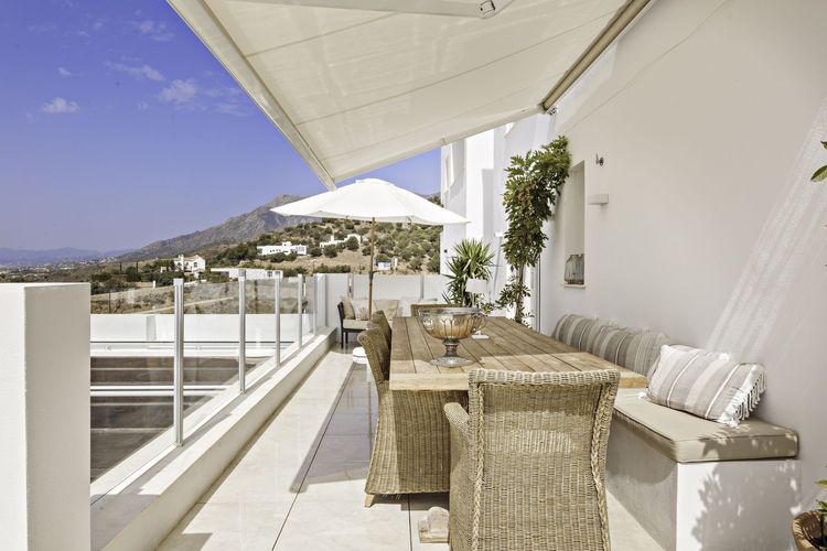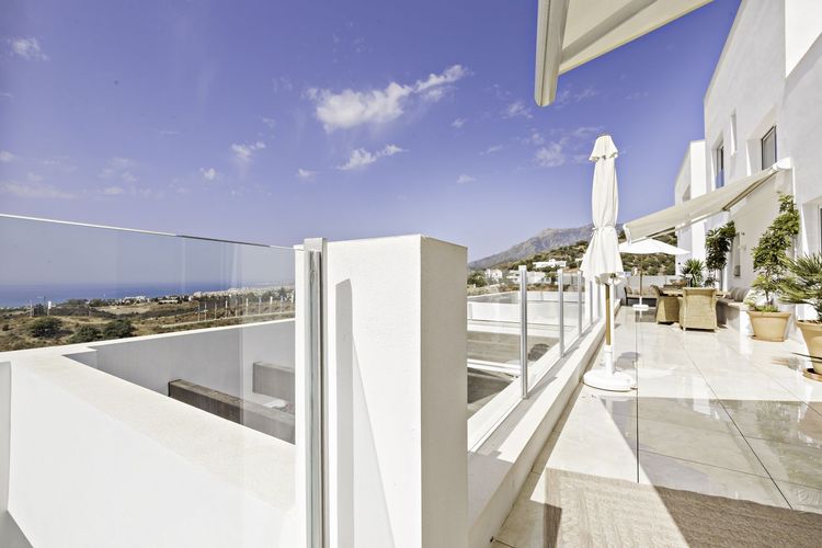 Het fantastische terras beneden beslaat de gehele lengte van de eerste verdieping, maar liefst 17,5 meter, en is toegankelijk vanuit zowel de woonkamer als de logeerkamer. Er past een grote tafel op, perfect voor bijeenkomsten op een warme Andalusische zomeravond, of voor een gezellige familielunch. De automatische zonwering kan desgewenst worden uitgeschoven om het gebied tegen de zon te beschermen. Aan het einde bevindt zich een privéhoekje met een gezellige zithoek waar u kunt genieten van een lekker glas wijn, een ontspannen gesprek en natuurlijk het fantastische uitzicht op de Middellandse Zee, Marbella en de nabijgelegen bergen. Een stukje paradijs bij u thuis!