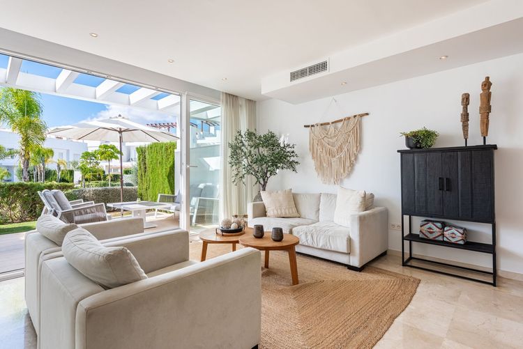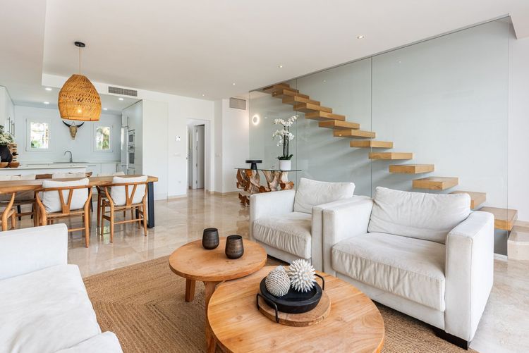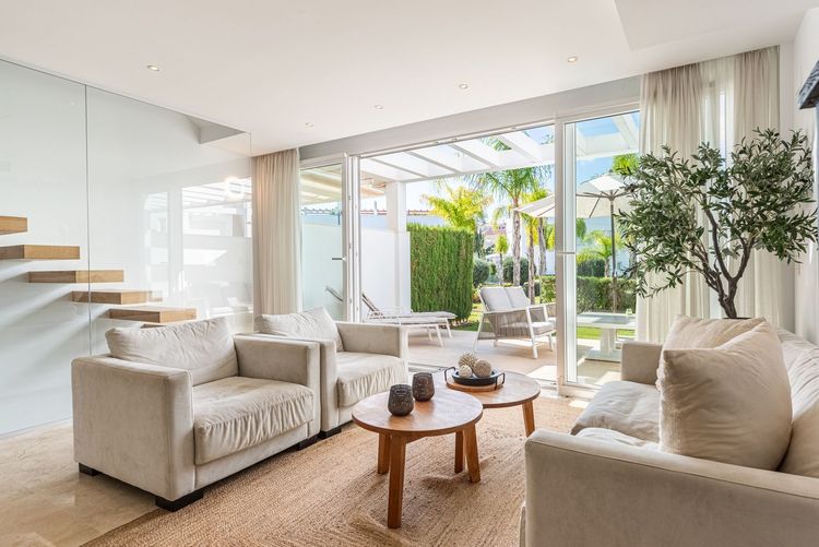 Het huis heeft 4 verdiepingen en beschikt over een grote open woonkamer met kamerhoge ramen die toegang bieden tot het terras en de privétuin, evenals de prachtig aangelegde gemeenschappelijke tuinen en het zwembad.