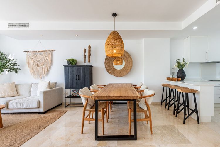 Moderne woning met een Balinees interieur, ontworpen met aardse tinten en natuurlijke materialen voor een warme, tropische sfeer.