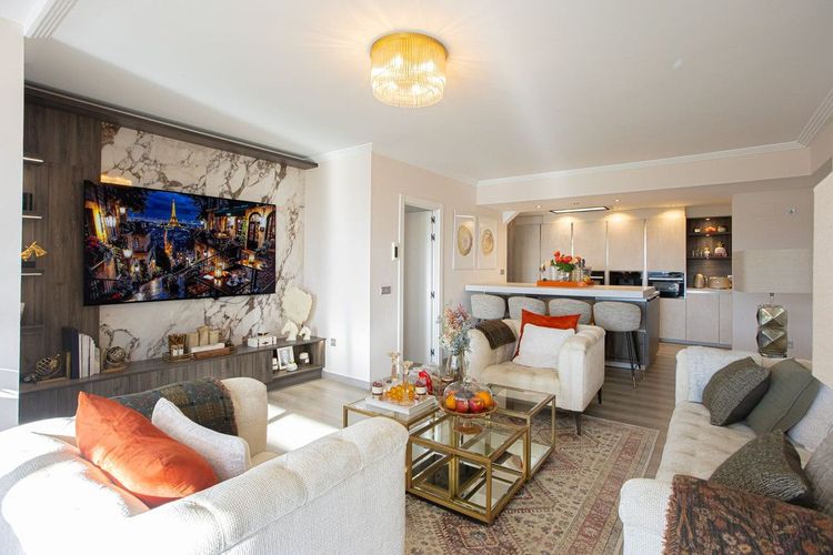 The apartment features four bedrooms, including a staff bedroom, and a generous open-plan living area with a modern American-style kitchen, creating a seamless and sophisticated space ideal for both everyday living and entertaining.