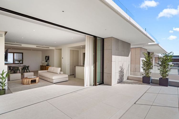 The apartment has 3 bedrooms, 2 full bathrooms, and a guest toilet. It has a usable interior area of 124.92 m² and a spectacular 104.13 m² terrace, ideal for enjoying the Costa del Sol climate all year round. Thanks to its orientation and privileged location, the property enjoys stunning panoramic views of the sea, the golf course, and the mountains.