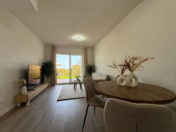 The apartment boasts a well-designed layout with a suite bathroom, a contemporary kitchen, and a cozy terrace overlooking lush gardens and fruit trees. With good light exposure and painted walls, this home radiates warmth and elegance. Additional features include a garage, alarm system, and access to garden services, ensuring a convenient lifestyle.