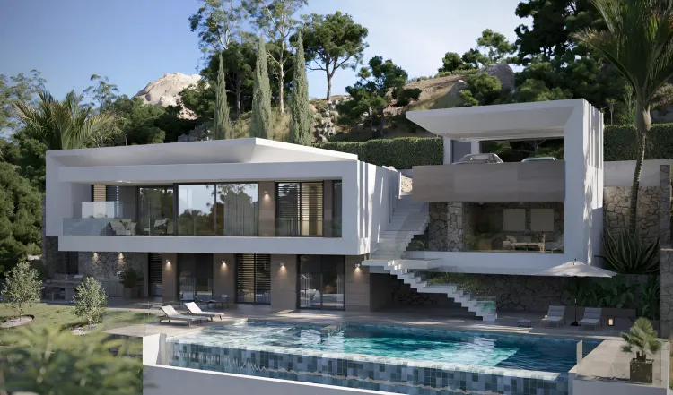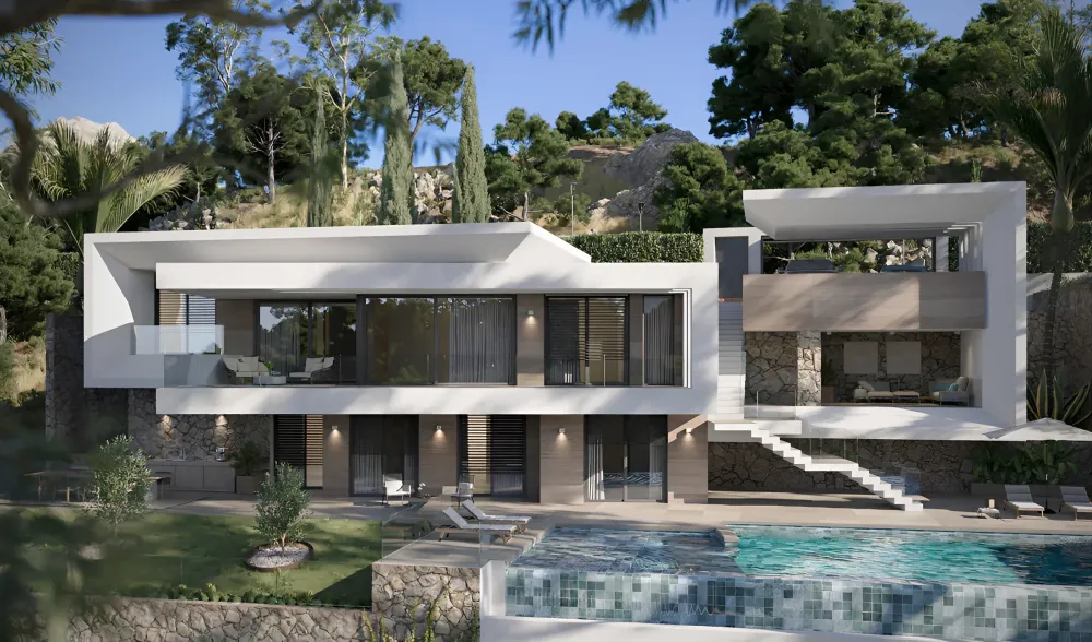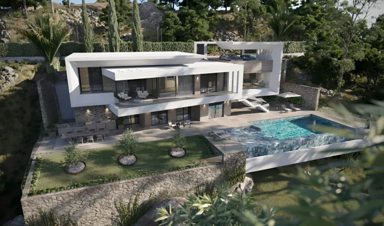 Deze villa is ontworpen om een harmonieuze mix te bieden van moderne architectuur en de natuurlijke schoonheid van de omgeving. Het ontwerp legt de nadruk op strakke lijnen, natuurlijke materialen en grote glaspartijen die zorgen voor veel natuurlijk licht en een continue verbinding met de betoverende buitenomgeving. Het project is momenteel beschikbaar en biedt de mogelijkheid om te genieten van mediterrane luxe.
