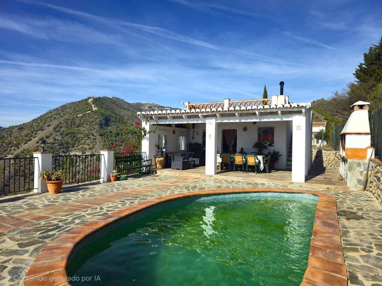 Gelegen op korte rijafstand van het witte dorp Frigiliana en het pittoreske gehucht Acebuchal, geniet de woning van een bevoorrechte ligging met een vrij uitzicht op de bergen, olijfbomen en het natuurlijke landschap van de Axarquía-regio. Vanaf het eerste moment voelt het huis warm en uitnodigend aan – witgekalkte muren, een gezellige open haard voor koelere dagen, een schaduwrijke veranda voor zomeravonden en een zwembad dat uitnodigt om te ontspannen of te genieten van een duik onder de sterren.