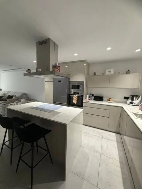 Ground floor open-plan kitchen opening onto the living room, toilet, and large terrace with a 2x3 meter saltwater pool, independent garage.