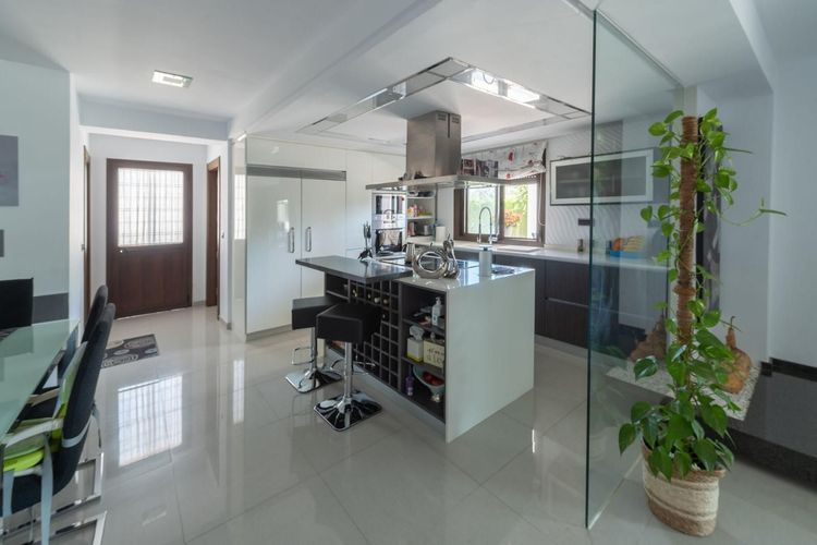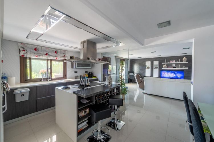 Parter, całkowicie odnowiony w nowoczesnym stylu, obejmuje salon z jadalnią, otwartą kuchnię, 3 sypialnie, łazienkę, pralnię i spiżarnię. Dom posiada również ogrzewanie podłogowe i klimatyzację.