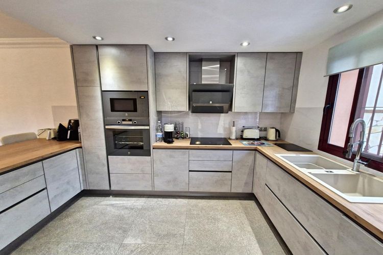Ta imponująca i przestronna nieruchomość, położona na narożnej działce, obejmuje: hol wejściowy na parterze prowadzący do jasnego i przestronnego salonu z wyjściem na taras przy basenie. Wysokiej jakości, nowoczesna, w pełni wyposażona kuchnia z barem śniadaniowym i przylegającą elegancką jadalnią. Z korytarza kuchennego prowadzi wejście do łazienki na parterze, pomieszczenia gospodarczego oraz schodów prowadzących do apartamentu gościnnego i garażu. W piwnicy znajduje się salon, kuchnia, dwie duże sypialnie dwuosobowe i łazienka. Do apartamentu można wejść z domu lub z garażu, w którym znajduje się siłownia.