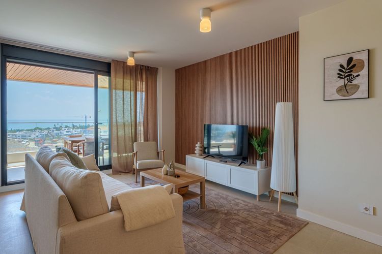 The open-plan living room, creates an inviting and serene space for relaxation. It opens seamlessly onto a large private terrace equipped with comfortable outdoor seating, ideal for al fresco dining or simply soaking in the panoramic sea views.