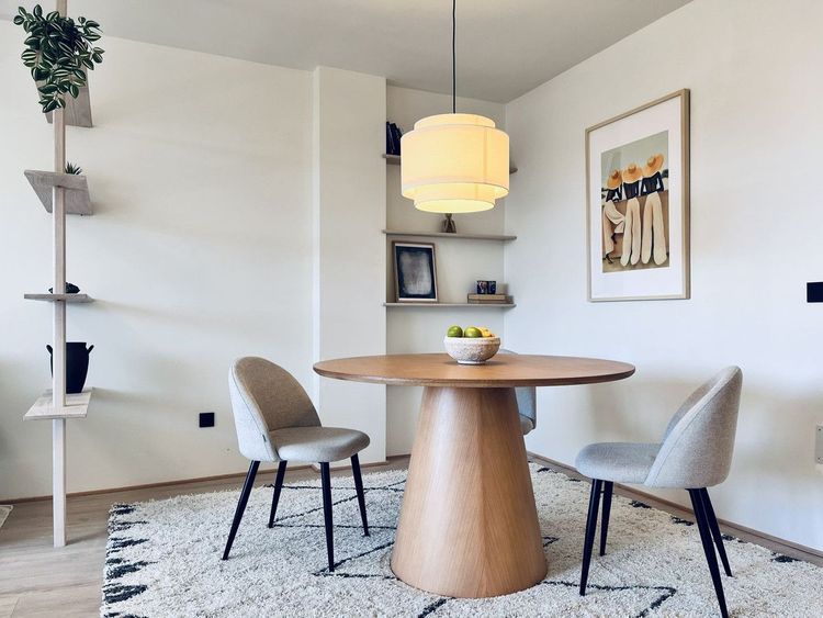 Wejście prowadzi do przestronnej i nowoczesnej, otwartej kuchni z jadalnią. Wykonana na zamówienie ścianka działowa z naturalnego dębu oddziela część wypoczynkową, umożliwiając swobodny przepływ światła przez całą przestrzeń, bez zakłócania otwartego charakteru.
