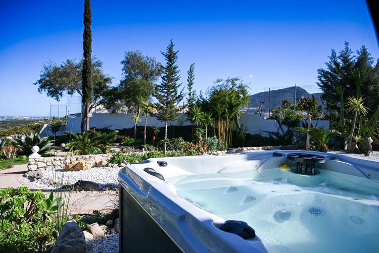 Outside, the property truly becomes a private Mediterranean retreat. A beautiful swimming pool, outdoor kitchen, solar-powered outdoor shower, and included 5-seat jacuzzi create a space designed for relaxation and entertaining. The landscaped garden, filled with fruit trees and equipped with automatic irrigation, enhances the sense of tranquility and connection to nature, while multiple terraces and outdoor areas allow you to enjoy the sun and views at any time of day.