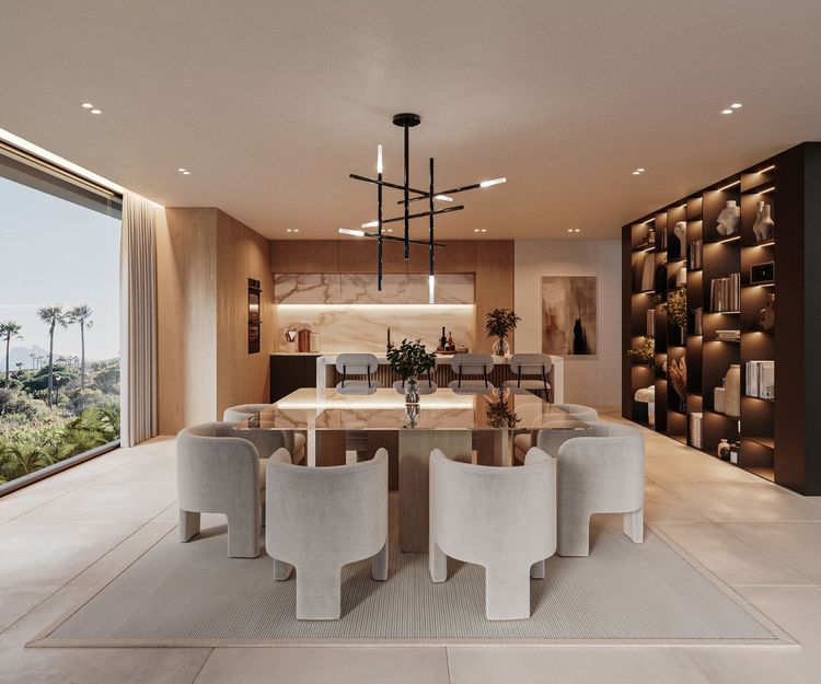 Nieruchomość, wykonana wyłącznie z najwyższej jakości materiałów i wykończeń, oferuje kuchnię SieMatic wyposażoną w sprzęty AGD marki Gaggenau i Liebherr, a także meble Roche Bobois, zarówno wewnątrz, jak i na zewnątrz. Eleganckie płytki Porcelanosa, detale Bisazza i okna Cortizo z przesuwanymi drzwiami podkreślają nowoczesną elegancję domu, uzupełnioną włoskimi drzwiami wewnętrznymi.