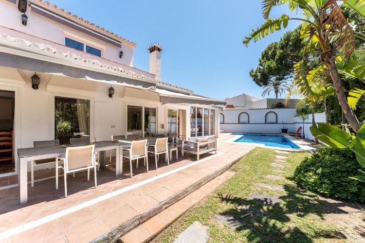 Beachside villa in Marbella. This 2-storey property consists of a living room, a well-equipped kitchen with dishwasher, 5 bedrooms and 3 bathrooms and can therefore accommodate 10 people. Additional amenities include high-speed Wi-Fi, air conditioning, a washing machine as well a satellite TV and a DVD player. Private outdoor area includes a pool, a garden, garden furniture, an open terrace, a balcony and a barbecue. Parking is available on the property.