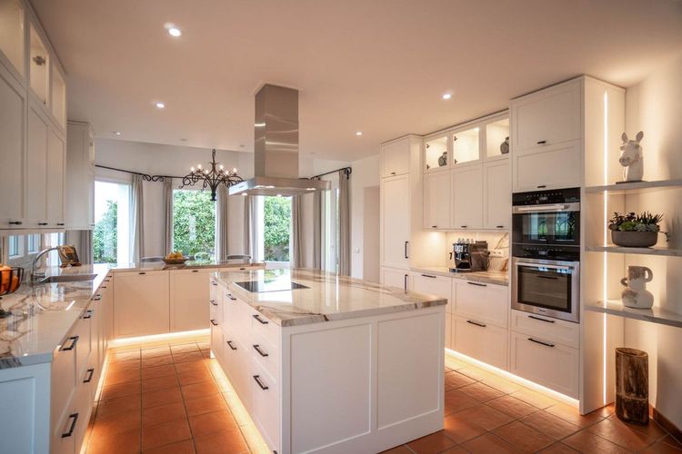 The villa also features a custom-made kitchen with Miele appliances, as well as practical spaces including a laundry room, technical room, gardener’s room, storage areas, and wine cooling room, all thoughtfully designed.