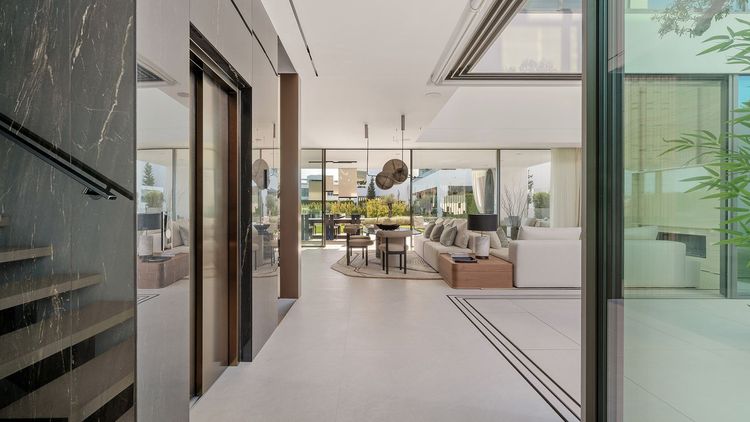 Willa zajmuje cztery starannie zaprojektowane piętra, połączone prywatną windą. Przestronny salon charakteryzuje się efektownym, dwupoziomowym sufitem, tworząc przestronną, otwartą atmosferę idealną do spotkań towarzyskich. Przejście z niego na pięknie zaprojektowany taras, idealny do łączenia życia w domu z życiem na świeżym powietrzu. Wewnętrzne patio, z dojrzałym drzewem oliwnym, dodatkowo podkreśla przestronność willi, łącząc naturę z designem. Nowoczesna kuchnia Gaggenau to marzenie każdego szefa kuchni, wyposażona w najwyższej klasy sprzęt AGD, łącząc styl z praktycznością.