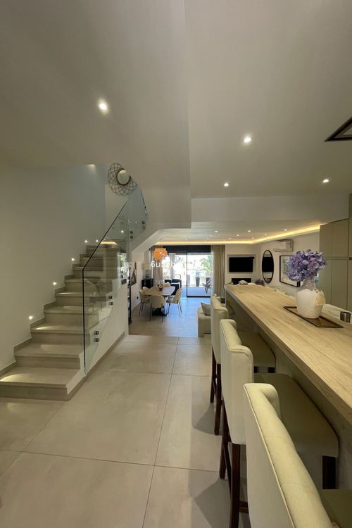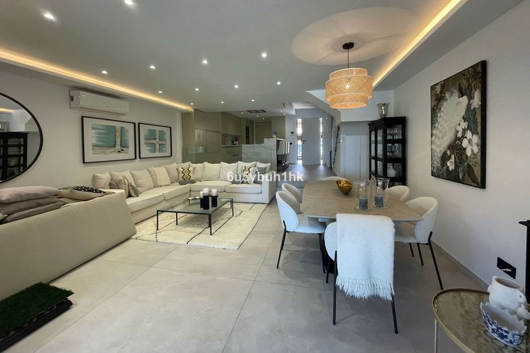 A well distributed bright south facing townhouse built over three floors, in a small beachfront community of houses, with direct access out to the beach through the community gate. The property has been fully reformed to a high standard with new carpentry, solar panels, security blinds, alarm and many personal touches and modern appliances. It has floor to ceiling windows, and good quality finishes throughout.