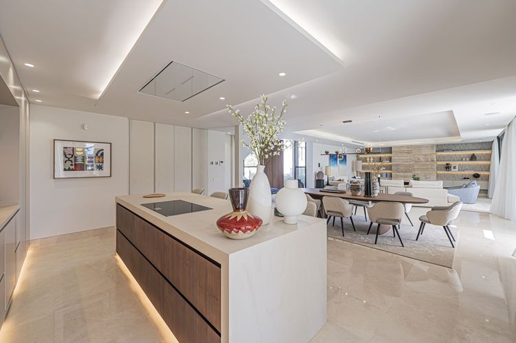 Elegant contemporary-style villa spread over three and four floors with a total of five bedrooms, five bathrooms, a large living room with an open-plan kitchen and dining area, a spectacular basement with a home theater, bar, billiards table, and a large solarium with beautiful sea and mountain views.
