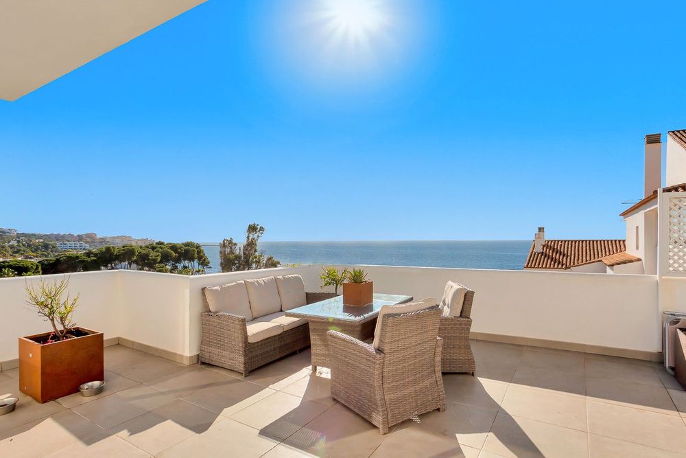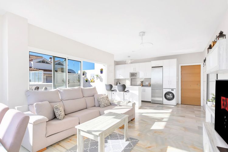 Beautiful recently refurbished one bedroom flat in a front line beach complex. It has a spacious bedroom, bathroom, modern kitchen open to the living room and large terrace with panoramic views to the sea and the communal areas of the complex. The price includes a spacious storage room.