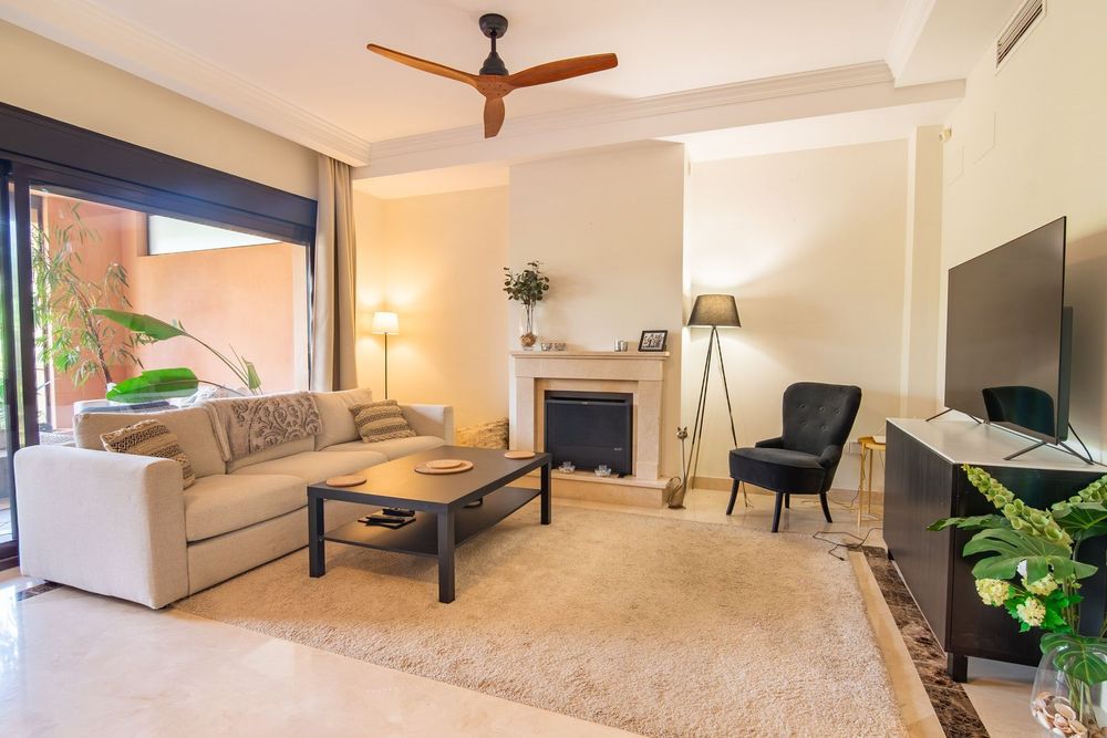 The spacious living room features a fireplace and large patio doors opening onto a sun-drenched terrace with sea and golf views. The terrace is enclosed with glass curtains, creating an additional year-round living area — ideal for relaxing or entertaining.