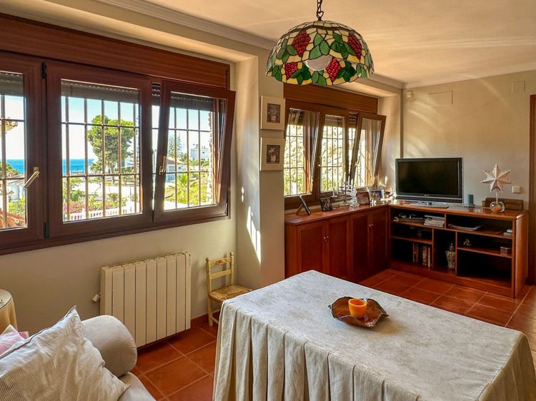 The main house features a thoughtfully laid-out floor plan, including a separate kitchen with ample counter space and storage. The spacious living room is the heart of the home, offering sea views. From here, there’s direct access to a large terrace where you can enjoy sunny days and evenings with Mediterranean vistas.