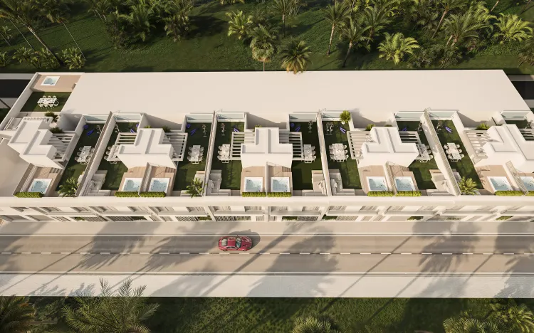 Alcantara del Mar is an exclusive new development offering a curated collection of 38 premium residences and 6 commercial properties, blending timeless Andalusian elegance with contemporary design. Developed by Edelburg Development, the project features 11 villas, 10 townhouses, and 17 apartments, ideal for investors seeking high rental yields from vacation rentals and long-term lets in this prime coastal spot. Properties boast spacious layouts, high ceilings of 2.85 meters, underfloor heating, fully fitted kitchens and bathrooms, floor-to-ceiling windows, private patios or solariums, underground parking, and optional furniture packages by renowned designer Gunni Trentino.