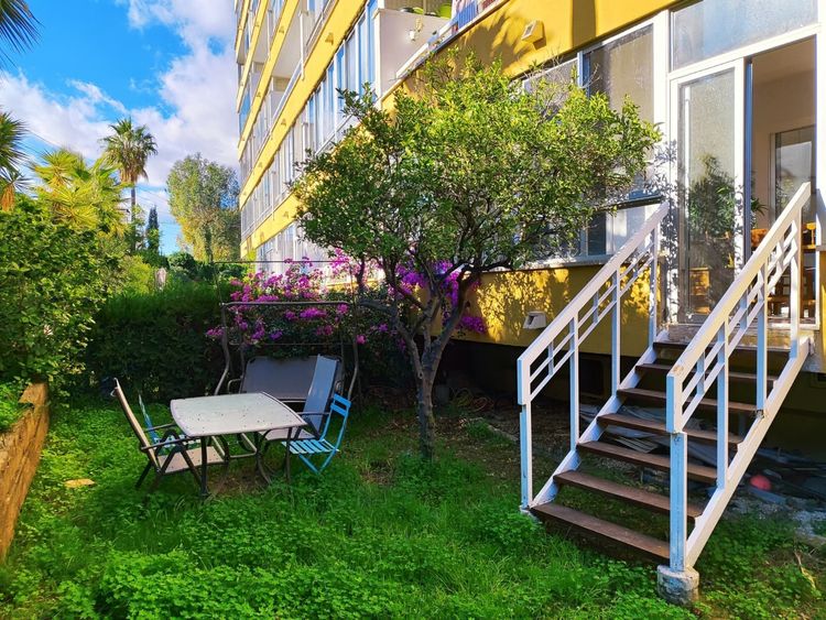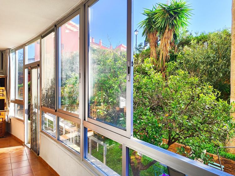 The flat boasts a spacious glazed terrace that opens onto a large private garden with lawn, trees and plants—perfect for enjoying outdoor living. The open-plan kitchen comes fully equipped with a washing machine and integrates seamlessly with the generous living–dining area, creating a warm and functional space. The bedroom includes built-in wardrobes providing plenty of storage, and the full bathroom is ready for immediate use.